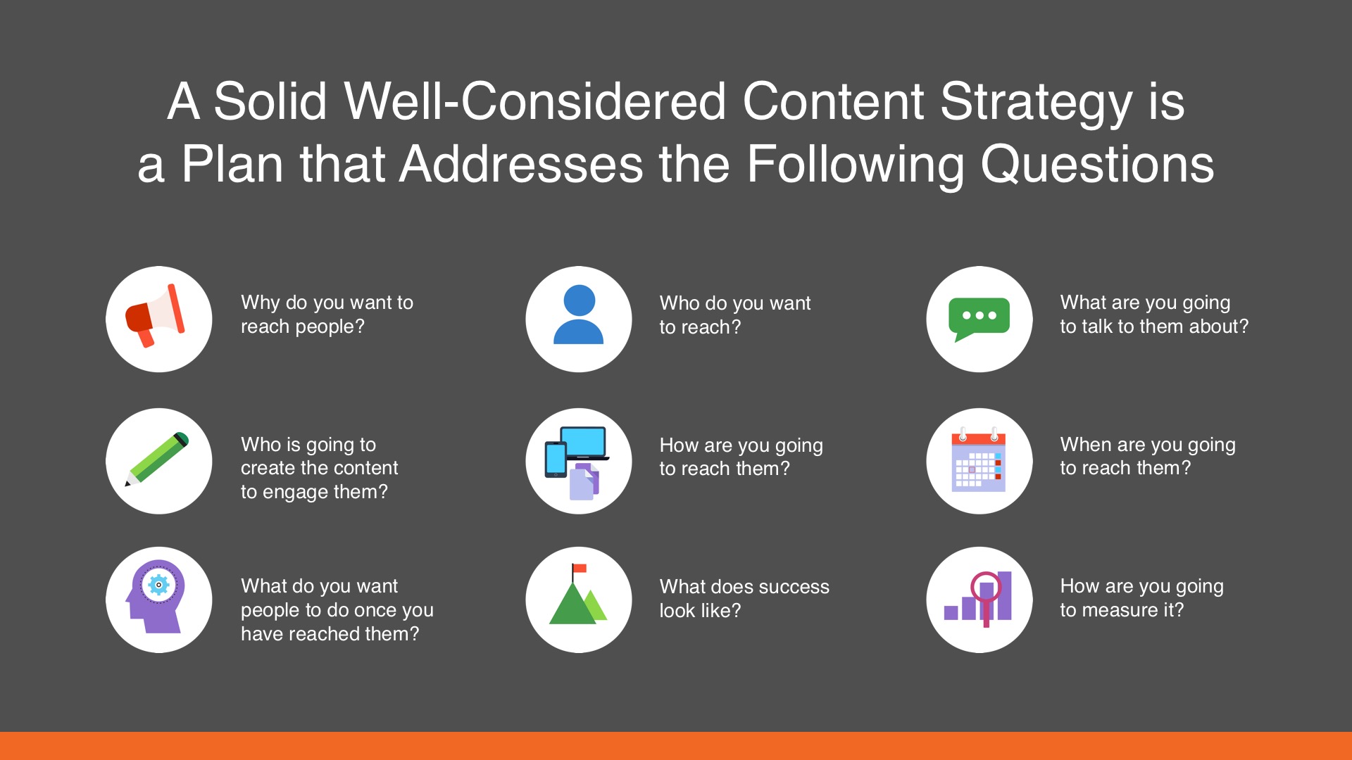 Last month, we held a three-part webinar series with our good friends at Curated Content, an Australian based Content Marketing agency. The slide below provides a framework for you to use (it’s the one I’m using) to develop our Content Marketing strategy.
